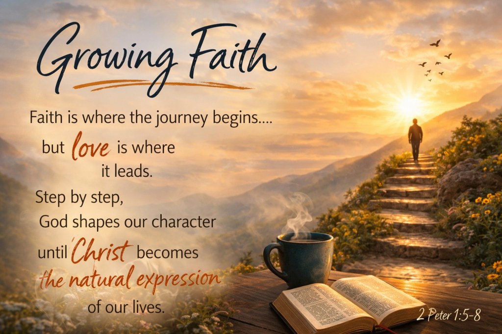 Heavenly Father, thank You for planting the seed of faith in our hearts. Help that faith grow into the character Peter describes—virtue, knowledge, temperance, patience, godliness, kindness, and love. Through Your promises, shape our lives day by day until the love of Christ becomes the natural expression of who we are. Keep our faith from becoming stagnant, and make our lives fruitful in the knowledge of our Lord. Amen.